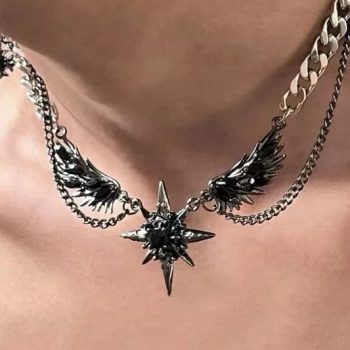Fleepmart Gothic Demon Wings Black Heart Pendant Necklace For Women Unique Silver Color Star Neck Chain Halloween Jewelry Gifts