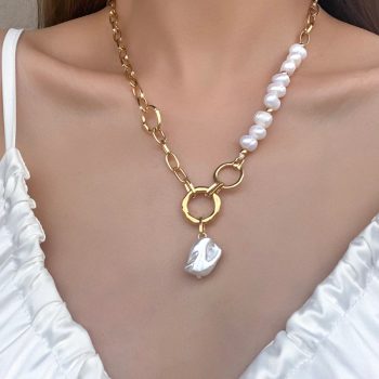 Fleepmart Irregular Natural Freshwater Pearl Pendant Necklaces for Women Chunky Chain Circles Baroque Pearl Necklaces Elegant