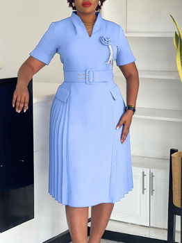 AOMEI Women Elegant Dresses V Neck Short Sleeves Pleated Waist Belt 3D Flowers Classy Church Business Party Female African New