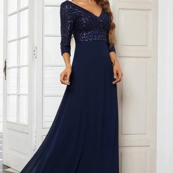 Fleepmart Sexy V Neck A-Line Sequin Wholesale Evening Dresses With 3/4 Sleeve Vestidos De Gala