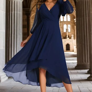 Fleepmart Elegant Evening Dress Long Sleeves Pleated Ruffles Knee-Length 2024 of Chiffon Navy Blue Wedding Guest Dresses