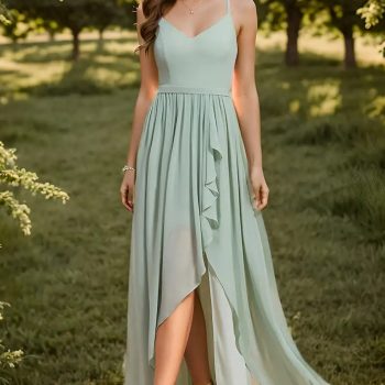 fleepmart Elegant Evening Dress Spaghetti Straps Slit With Ruffle Detail 2024 of Chiffon A-Line Mint Green Bridesmaid Dress