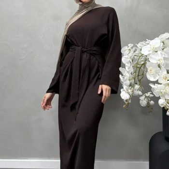 Fleepmart 2025 Elegant Loose Cotton Linen Belted Single Color Muslim Dress Southeastern Middle Eastern Style Ankle-length Full Sleeve