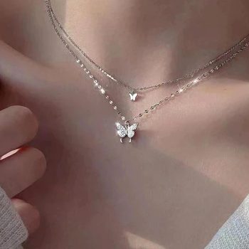 Fleepmart New Korean Silver Color Shiny Butterfly Necklace Ladies Exquisite Double Layer Clavicle Chain Necklace Jewelry Gift