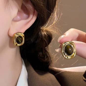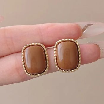 Fleepmart Retro Square Metal Frame Stud Earrings Brown Acrylic Oval Bead Party Trendy Geometry Jewelry
