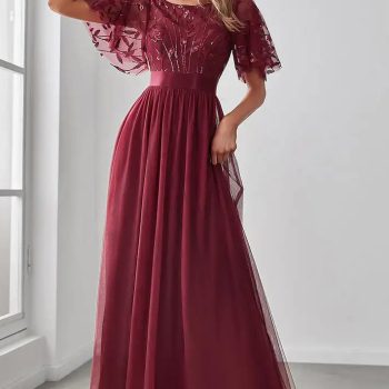 Fleepmart Elegant Evening Dresses Sequin Print Maxi Long with Cap Sleeve A-LINE 2024 Ever Pretty of Burgundy Gauze Prom Dresses Of Women