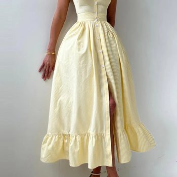 Fleepmart Elegant Blue Striped Ruffled Button Long Dress Women Square – Neck Sleeveless Female Dresses 2025 Summer Beach Party Lady Robe