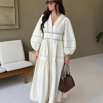 Fleepmart Elegant Lace Hollow Out Women’s Long Dress Solid V-neck Patchwork Puff Sleeve Bodycon Dressess Female 2025 Spring New Lady Robes
