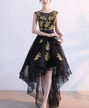 Banquet Evening Dress New Elegant Black Appliques Short Front and Long Back Prom Party Short Gowns