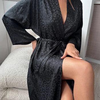Fleepmart Leopard Print Night Robe Long Sleeve V Neck Robe With Belt Women’s Sleepwear