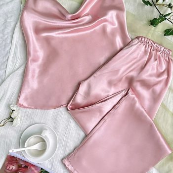 fleepmart Solid Satin Pajama Set Draped Collar Cami Top Elastic Waistband Pants Women’s Sleepwear Loungewear