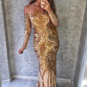 Fleepmart Off the Shoulder Stretch Gold Sequin Maxi Dresses Full Lining Backless Evening Night Prom Dress