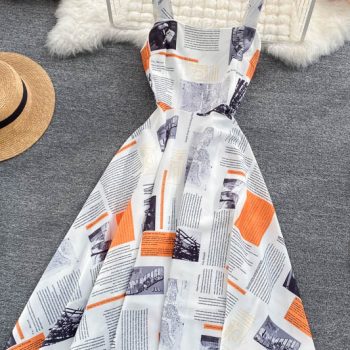 Fleepmart Square Collar Magazine Print Midi Dress For Women 2022 Slim Elegant Spaghetti Strap Prom Vintage Kawaii Dresses