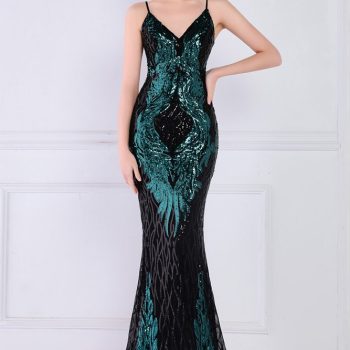 Fleepmart Women Strap Maxi Dress Sexy V Neck Evening Dress Green Sequin Dress Long Prom Dress
