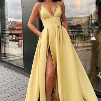 Fleepmart Sexy V-Neck Evening Dresses Satin Spaghetti Strap Side Slit Prom Dress High Waist Evening Gown Party Robe de soiree