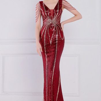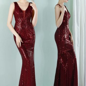 Fleepmart New Women Elegant Double V-neck Sleeveless Burgundy Evening Dress Sexy Mermaid Sequin Women Floor length Party Dress Vestidos