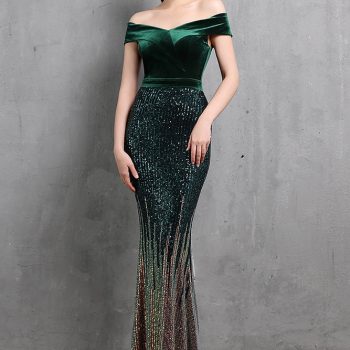 Fleepmart Slash Neck Full Evening Dress Elegant Velour Patchwork Sequins Slim Party Dress Mermaid Formal Gowns Women Dress Long
