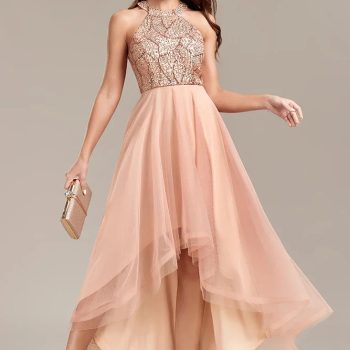 Fleepmart New Women Sleeveless Halter Shinning Sequin Tulle Evening Dress Irregular Hem Prom Dresses Golden Birthday Party Gold Dress