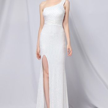 Fleepmart Women Beads Party Wedding Long Prom Dress Elegant One Shoulder Gold Sequin Evening Dress
