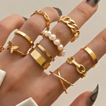 Fleepmart Fashion Gold Color Metal Rings Set for Women Chain Geometric Finger Ring Pearl Rings Party Jewelry Gifts