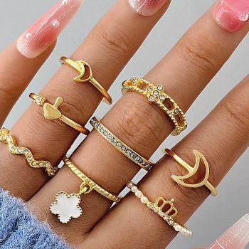 Fleepmart Flower Finger Ring Sets for Women Simple Crescent Moon Metal HollowPoint Drill Jewelry Party Anillos 8Pcs/Set