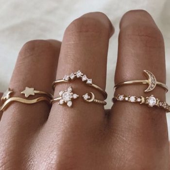 Fleepmart Fashion Vintage Gold Crystal Star Moon Knuckle Ring Set For Women Bohemian Geometric Flower Alloy Charm Ring Jewelry Gift