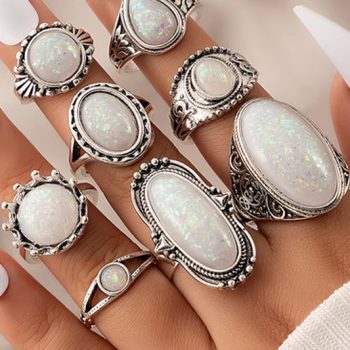 Fleepmart Vintage Antique Silver Color Rings Sets Colorful Opal Crystal Stone Carve Women Bohemian Jewelry