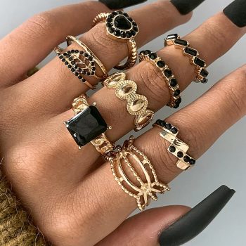 Fleepmart Bohemain Black Crystal Stone Heart Joint Ring Sets Charms Leaf Geometry Jewelry for Women Jewelry 8pcs/sets Anillo