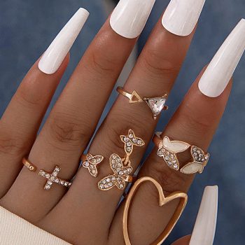 Fleepmart Luxury Crystal Stone Heart Joint Rings Set for Women Trendy Butterfly Cross Rings Set Jewelry Party 5pcs/set
