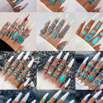 Fleepmart Vintage Green Stone Flowers Snake Ring Sets for Women Men Charms Moon Cactus Eyes Geometry Party Jewelry Gift Anillo