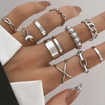 Fleepmart 10Pcs/Set Bohemian Geometric Metal Ring Set Women's Vintage Silver Plated Black Pearl Butterfly Finger Knuckle Ring Jewelry Gift