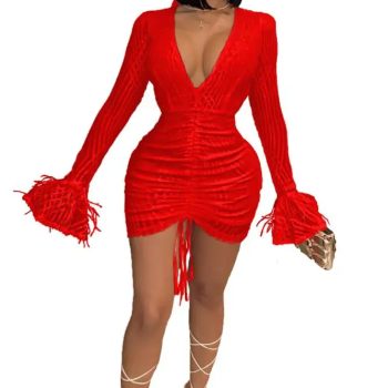 Fleepmart Elegant Feather Sequin Mini Women Dress Sexy Deep V Neck Flare Sleeve Ruched Lace Up Bandage Bodycon Club Party Dress Women Robe