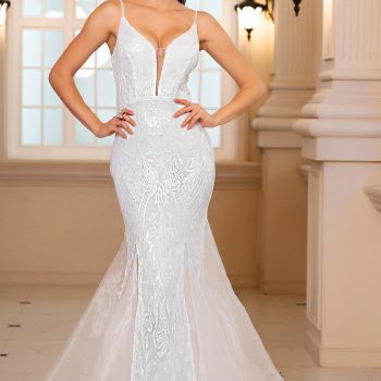 Fleepmart Sleeveless V Neck Sequined Mermaid White Wedding Party Dress Backless Floor Length Evening Prom Gown