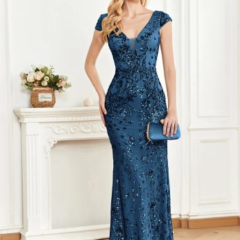 Fleepmart Luxury Sexy Deep V-Neck Sequins Blue Evening Dress Women Elegant V-back Wedding Party Long Prom Cocktail Dress