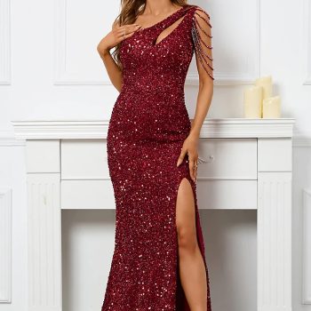 Fleepmart Sexy Slit Burgundy Sequin Dress Women One Shoulder Beading Long Evening Dress Party Maxi Dress