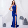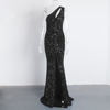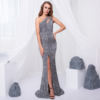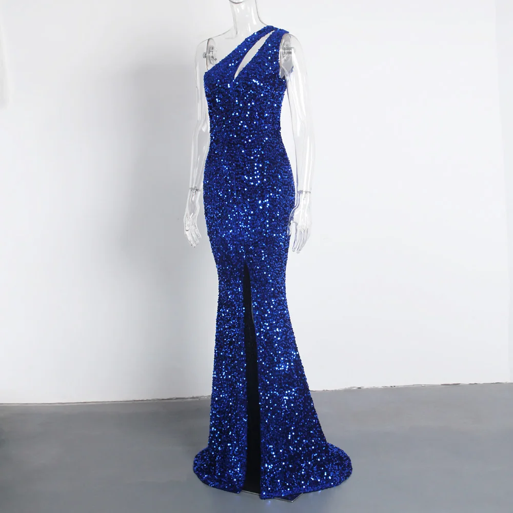 fleepmart 2021 Sexy Hollow Out Grey One Shoulder Sequins Maxi Dress Stretch Split Sleeveless Floor Length Mermaid Formal Party Dress Blue