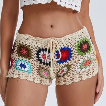 Fleepmart Women’s Knit Crochet Shorts Beach Summer Casual Hollow Out Elastic Waist Drawstring Short Pants Female Lounge Sleep Bottoms Y2K