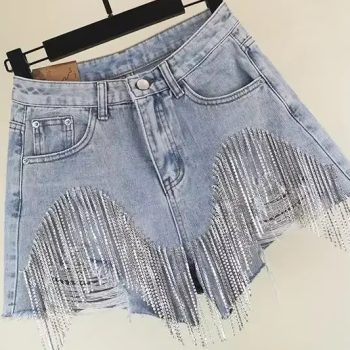 Fleepmart New Summer Women High Waist Diamond Tassel Ripped Jeans Shorts Y2k Casual Bottoms Denim Shorts