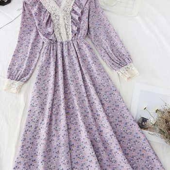 Fleepmart Elegant V-neck Chiffon Midi Dress Women Lace Stitching Slim Floral Dress Party Vestidos Spring Summer A-line Dresses 2021