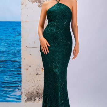 Fleepmart Sexy Green Tube Top Halter Sleeveless Tunic Sequined Fishtail Floor Mopping Party Maxi Dress