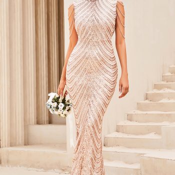 Fleepmart Plus Size Sexy Rose Gold Deep V-Neck Off-The-Shoulder Bodycon Elastic Sequins Maxi Dress