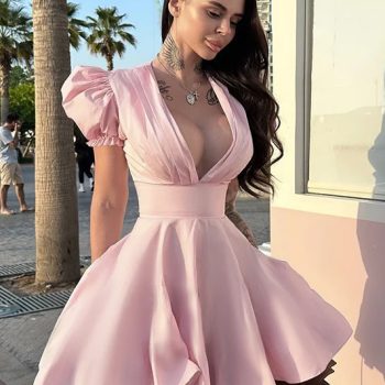 Fleepmart Puff Short Sleeve Ball Gown Mini Dresses Women’s Summer Drawstring High Waist V Neck Ruched A Line Short Dress