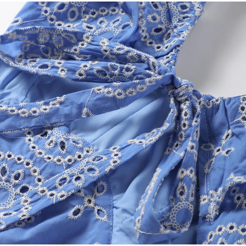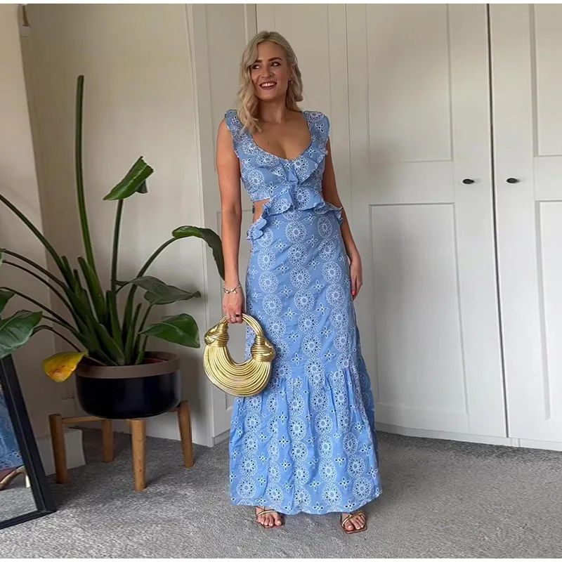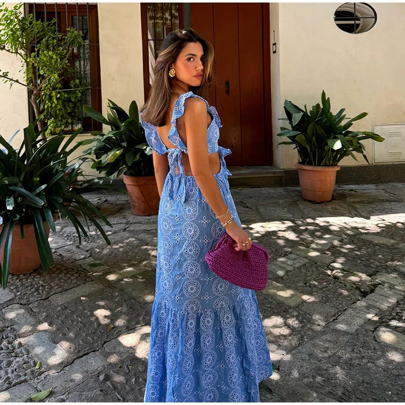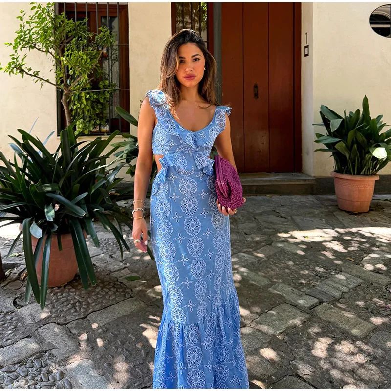 Summer Hollow Out Embroidery Maxi Dress For Women Sexy Sleeveless Backless Ruffle Long Beach Dress 2024 Holiday Lady Party Robe