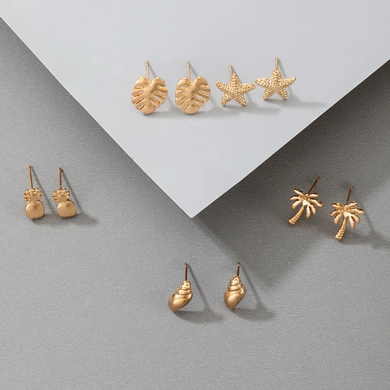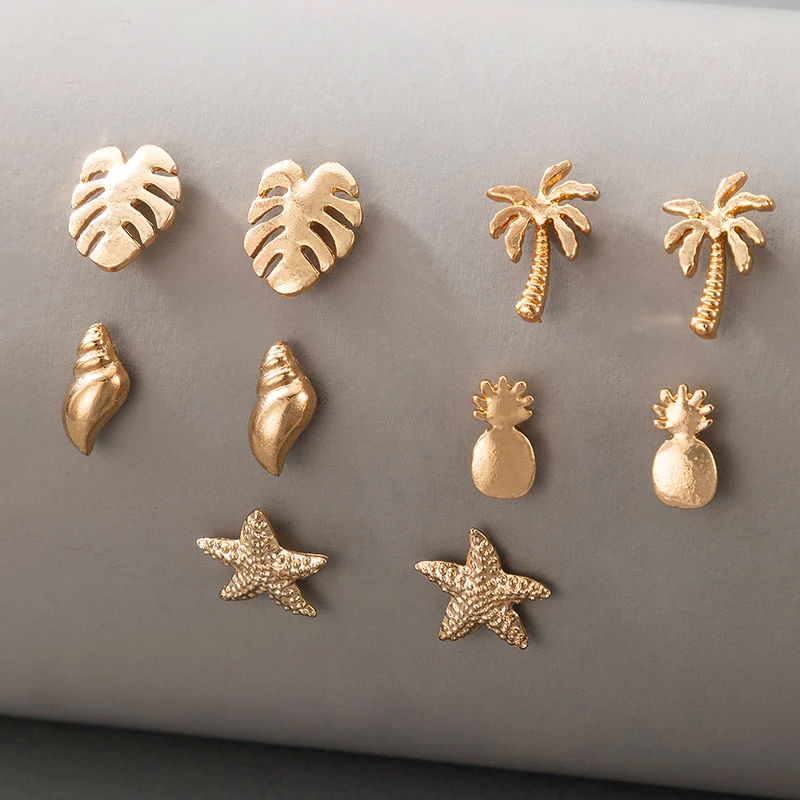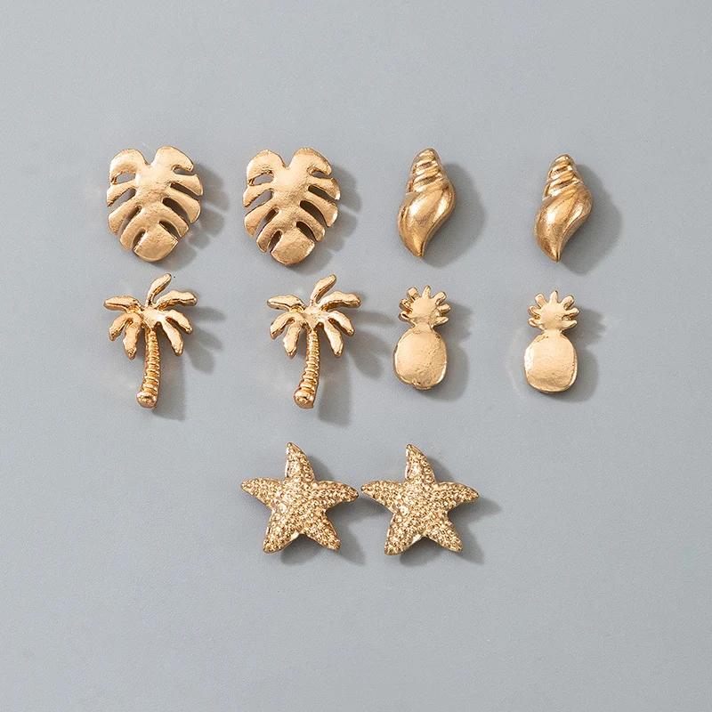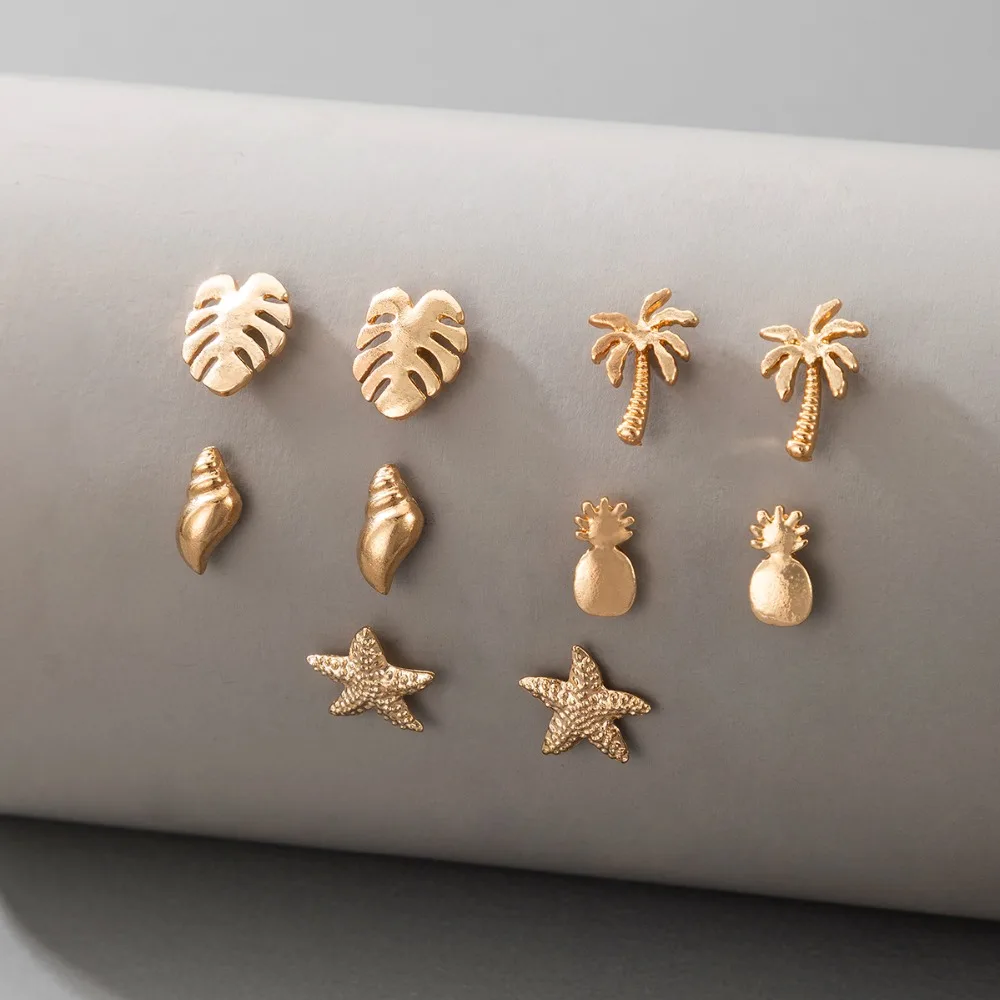 Fleepmart 5pair/sets Bohemian Leaf Earrings Set for Women Exuquisite Starfish Pineapple Conch Summer Jewelry Accessories