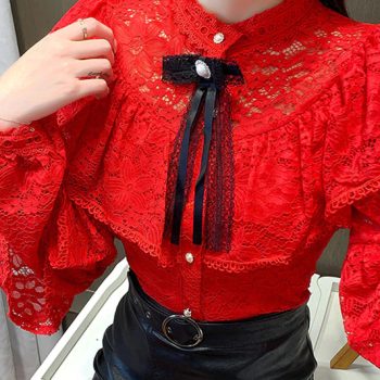 Fleepmart Elegant Fashion Lace Bottoming Women's Shirt Autumn Hollow Flower Ruffle Blouse Bow Beading Long Sleeve 6 Colors Blusas