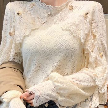 Fleepmart New Crochet Lace Blouse Women Chic Ruffle Lace Stitching Shawl Ladies Stand Collar Tops 2022 Spring Long Sleeve Slim Shirt