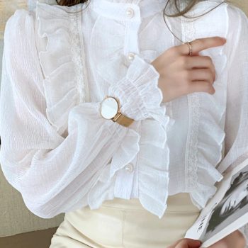 Fleepmart Ruffle Lace Chiffon Shirt Elegant Sweet Chic Long Puff Sleeve Women Blouse Apricot Tops Stand Collar Clothes Blusas