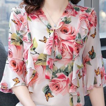 Fleepmart Office Pink Ruffle Tops sweet lady top Flower Print Blouse Women Summer Chiffon Shirt Fashion female Short-sleeve Blusas Mujer