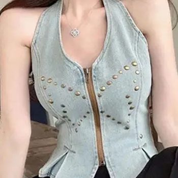 Fleepmart Women’s Sexy Denim Short Tank Tops Crop Top 2024 Irregular Zipper Delicate Bustier Vest Ladies Skinny Jeans Halter Top Bralette