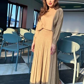 Fleepmart T-shirt Pleated Skirts Set Women Casual O-neck Long Sleeve Top A-line Long Skirt 2 Piece Set Female 2024 Spring New Outfits